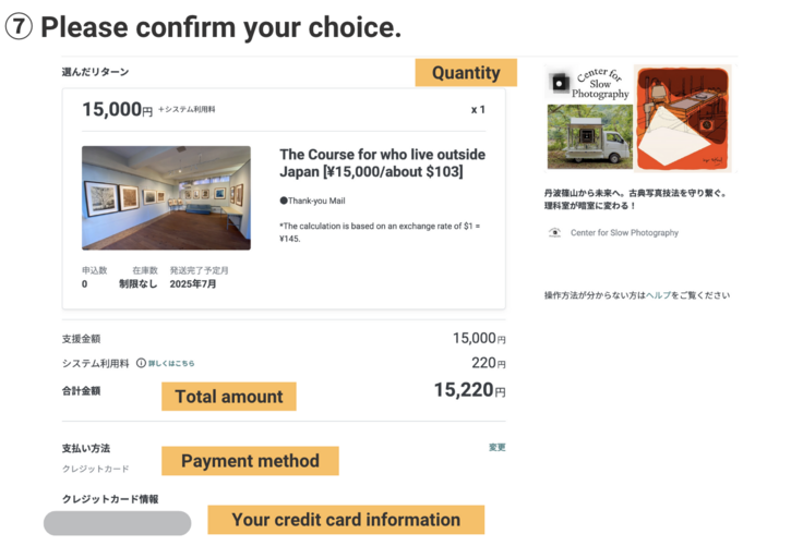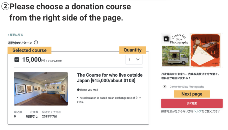 You can transfer your support directly to Center for Slow Photography, and Center for Slow Photography will take care of the support procedures on your behalf and reflect your support on the crowdfunding page.