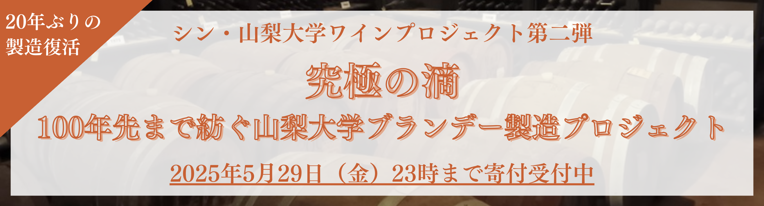 シン・山梨大学ワインプロジェクトは、次世代のワイン産業を牽引する学生たちの後押し、日本ワイン研究の礎である山梨大学ワイン科学研究センターの発展、そして10年、50年、100年後に繋がるブドウ栽培技術やワイン醸造技術を提案することを目指すものです。これら目標に対し、多くの方々からご賛同をいただけたことを大変嬉しく思っております。