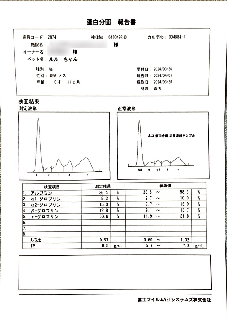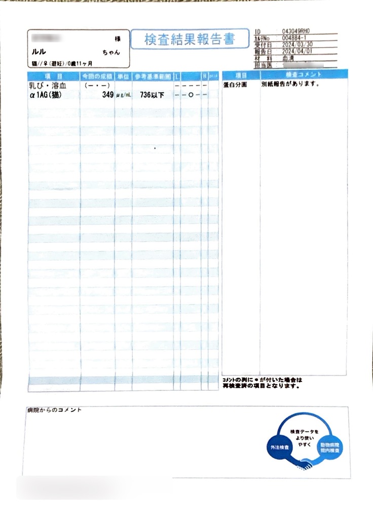 本日、FIP治療をして下さっている病院から、検査結果が届きました。