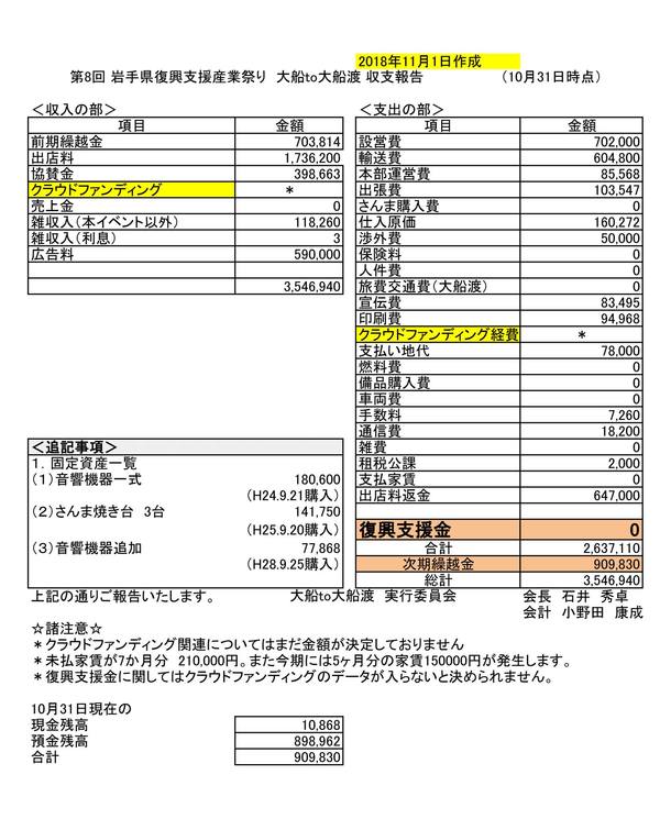大船渡への寄付も現時点では0円としておりますが、協賛金箱はじめ皆様方から大船渡への支援のお気持ちをお届けしなければならぬと感じておりますので、すべての清算が終わった時点で繰越金の中から些少ではありますが寄付させて頂こうと思っております。