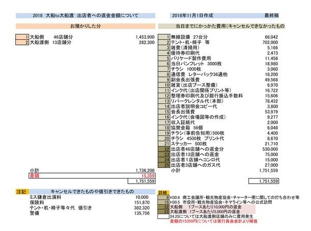出店者の皆様には当初のお約束通りの返金をさせて頂いたことによりどのような会計になったのかをご確認下さいませ。急な中止となりましたが、皆様方のご協力と実行委員の努力により出費を最小限に抑えることが出来たと思っております。