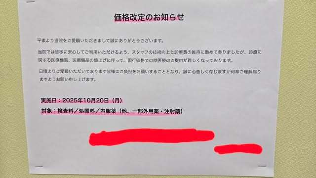 16日木曜日に病院へ行ったとき、『価格改定』の貼り紙を見つけました。