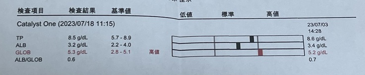 グロブリンの数値が、正常値は2.8〜5.1なのですが、前回の7/3の検査の時5.2で0.1オーバーしていたものが、7/18の検査では0.2オーバーでした。