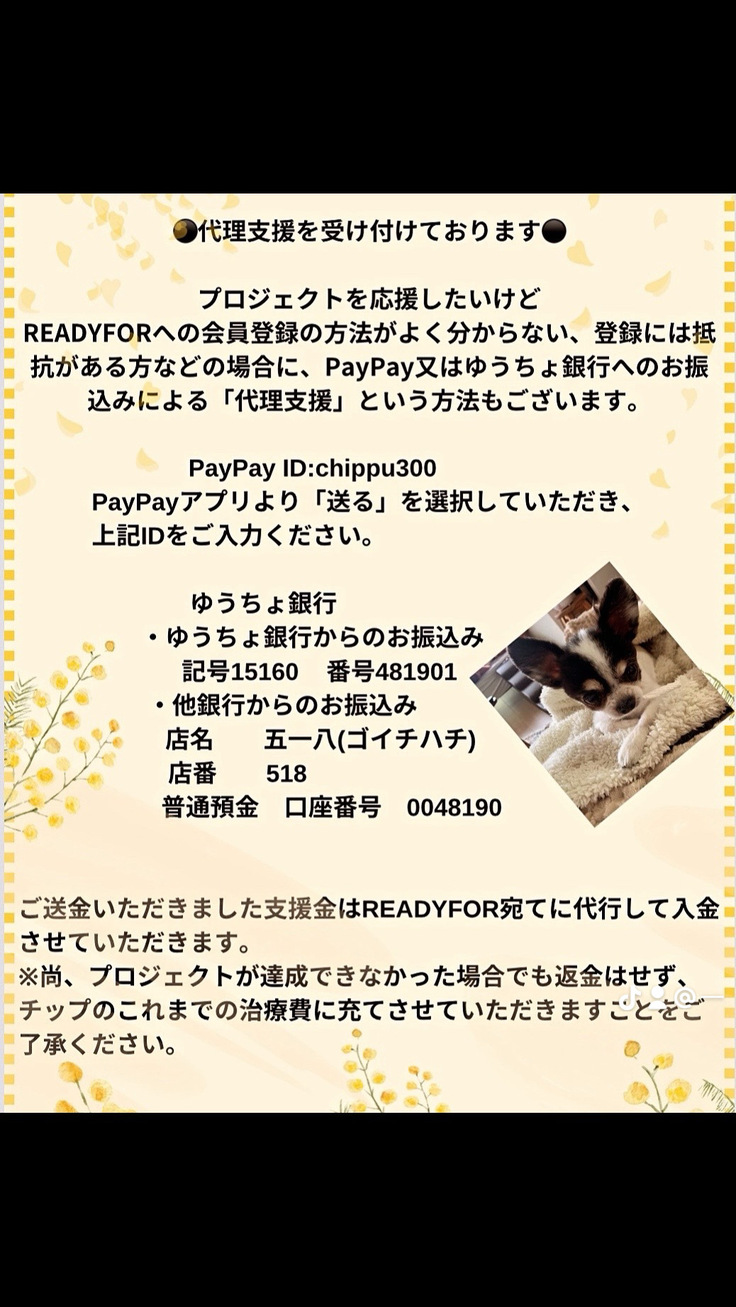 (For people who want to support our project but do not know how to register on the READYFOR platform, or do not want to register on a platform, we also accept alternative payment methods for donations as PayPay or bank transfers through Yucho Bank.Please send your donations to this PayPay ID: chippu300You can use the option "Send" in the app PayPay and use the ID mentioned above to send a donation.For bank transfer with Yucho Bank:From Yucho bank accounts:Postal code: 15160 Account No: 4841901From other banks:Bank: Yucho Bank (Postal Savings)Branch No: 518Account No: 0048190All the money that will be sent will be sent to READYFOR for the whole funding processNote: If the project cannot be fulfilled, all the money collected thus far will be used for Chip’s health expenditures and no refunds will be possible.)