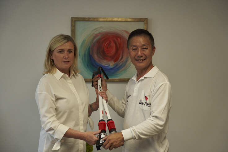 JINRIKI QUICKは既存の車いすにワンタッチで着脱可能な「車いすのけん引装置」です。