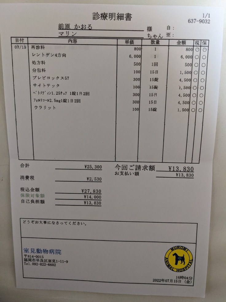 ⚫この明細書は、7月15日に診察とレントゲンと内服薬処方の分です。