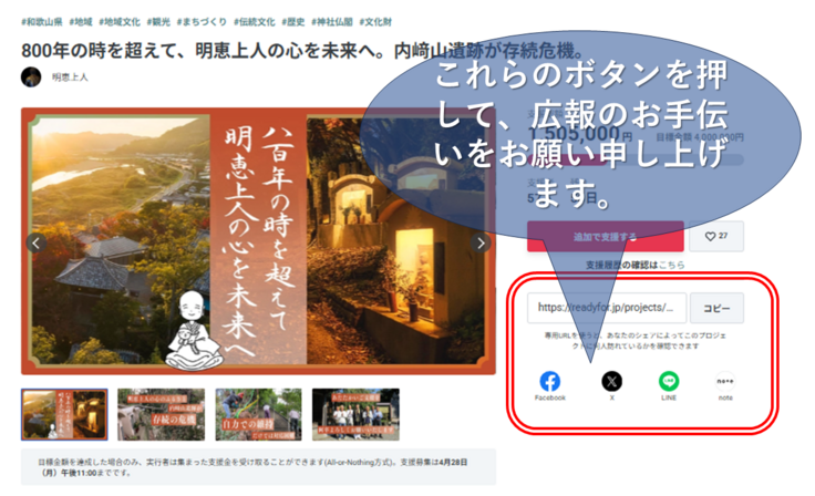 一週間が経過し、当山のクラウドファンディングページへの訪問者数が減少傾向にあります。つきましては、皆様に当クラウドファンディングをSNS等でご紹介いただけますと大変助かります。ご紹介いただく際は、クラウドファンディングページの共有ボタンをご利用いただくと簡単です。皆様のご協力を心よりお願い申し上げます。