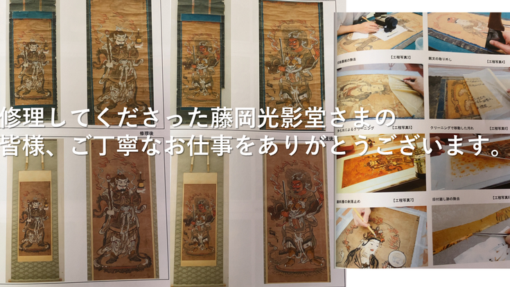 ご協力いただいた皆様、心から感謝申し上げます。皆様の寄付と励ましのおかげで、長年の歴代住職の夢が実現しました。藤岡光影堂さんとのご縁、そして同社のスタッフの皆様の技術により、十二天巻物の修繕が実現しました。この素晴らしいご縁と専門家の技術に心より感謝申し上げます。ありがとうございます。
