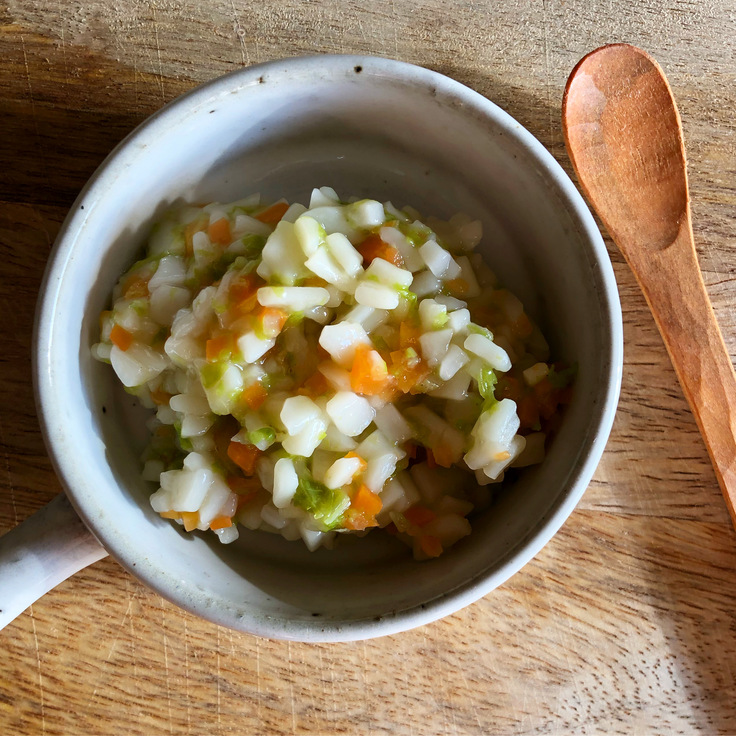 季節のお野菜を使い厳選した調味料でほんの少し味付けをしたカミカミセット。3回食に進み、咀嚼の練習をしていけるよう具材のサイズや切り方にこだわりました。