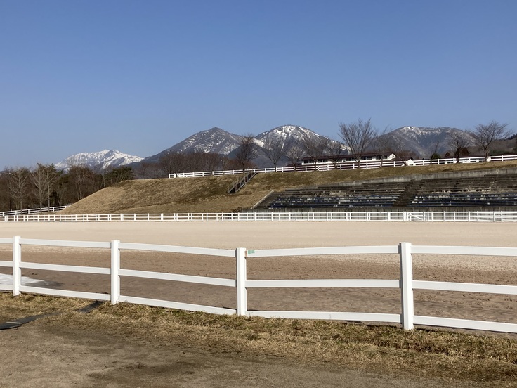 わたしがトレーニングに取り組んでいます蒜山ホースパークの馬場の雪もすっかり解け、先回の練習から外の馬場でパートナーの童夢とともに練習に取り組んでいます。