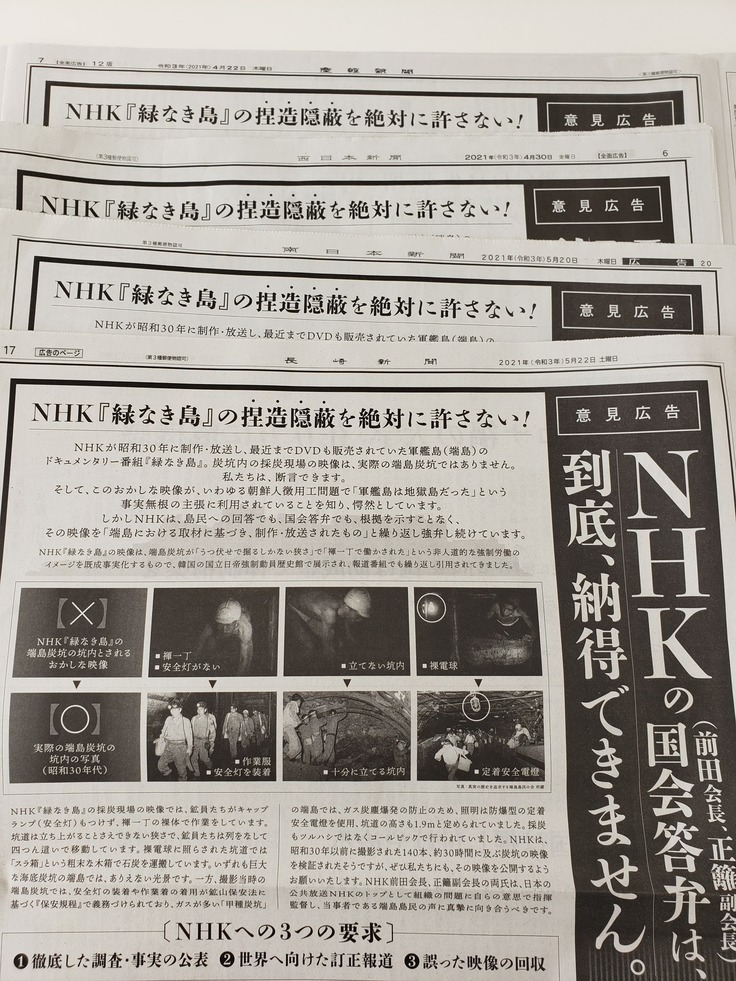 そこで、私たちは昨年、皆様から多大なご支援を頂き、このNHK「緑なき島」に関する「意見広告」を産経新聞(2021年4月22日)、西日本新聞(2021年4月30日)、南日本新聞(2021年5月20日)、長崎新聞(2021年5月30日)に掲載し、私たちのNHKに対する主張である徹底した調査・事実の公表 世界へ向けた訂正報道 誤った映像の改修を広く訴えました。