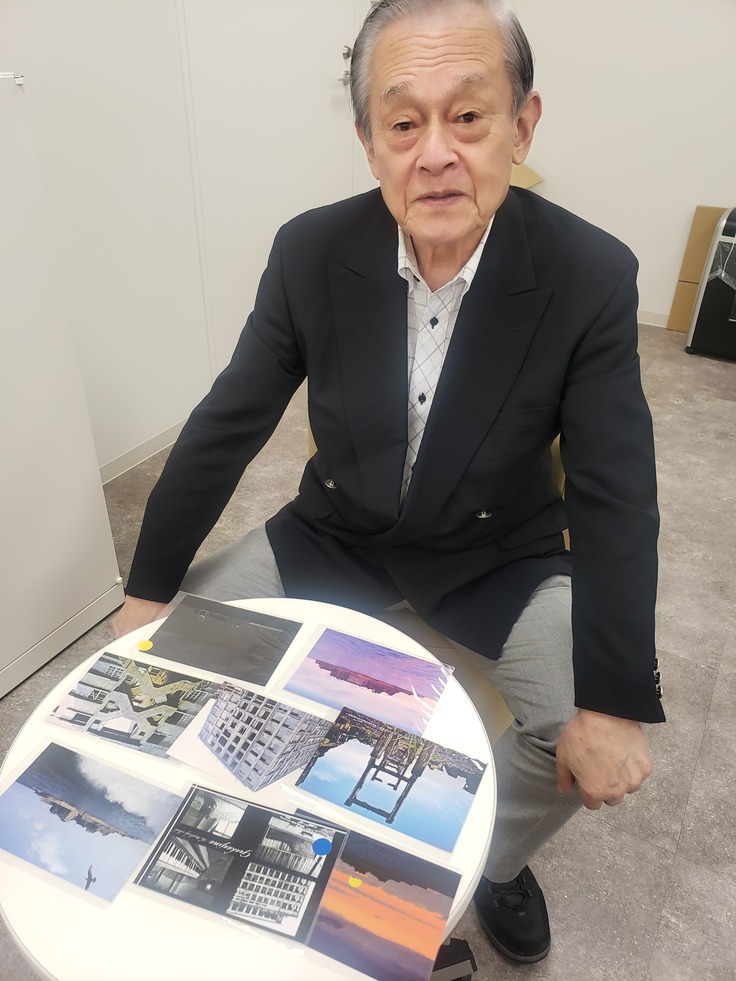 市販の軍艦島のポストカードを見て、アイデアを膨らませます。