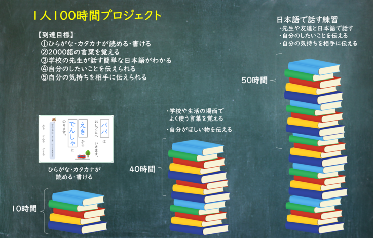 「1人100時間プロジェクト」は、わずか "100時間” の日本語学習で、外国人の両親を持つ子どもたちに義務教育の8,830時限獲得の機会を作ります。