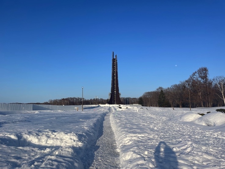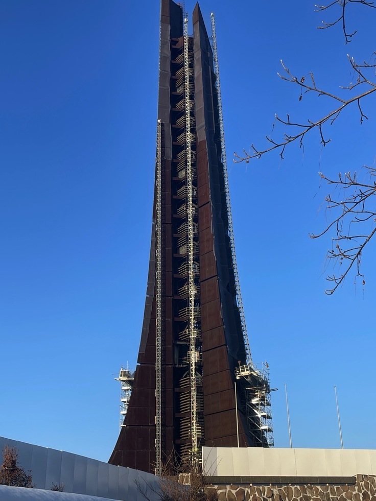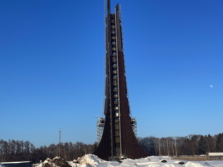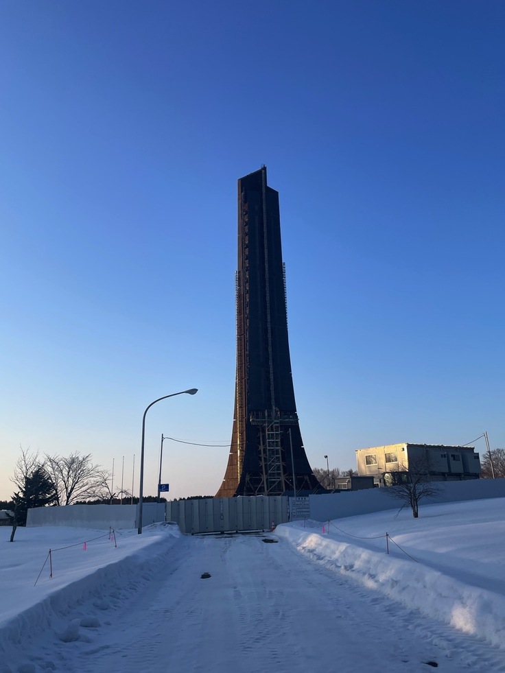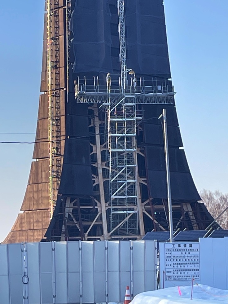 今日の北海道百年記念塔です。先週はご報告できず申し訳ありませんでした。久しぶりのご報告となりますが、作業用のリフトが四方に取り付けられました。エレベーターホールと階段は取り去れたのか、ルーバーから向こうが見えます。