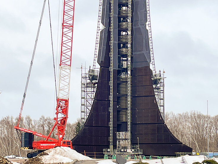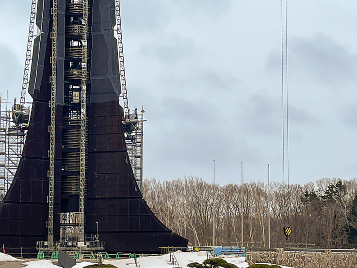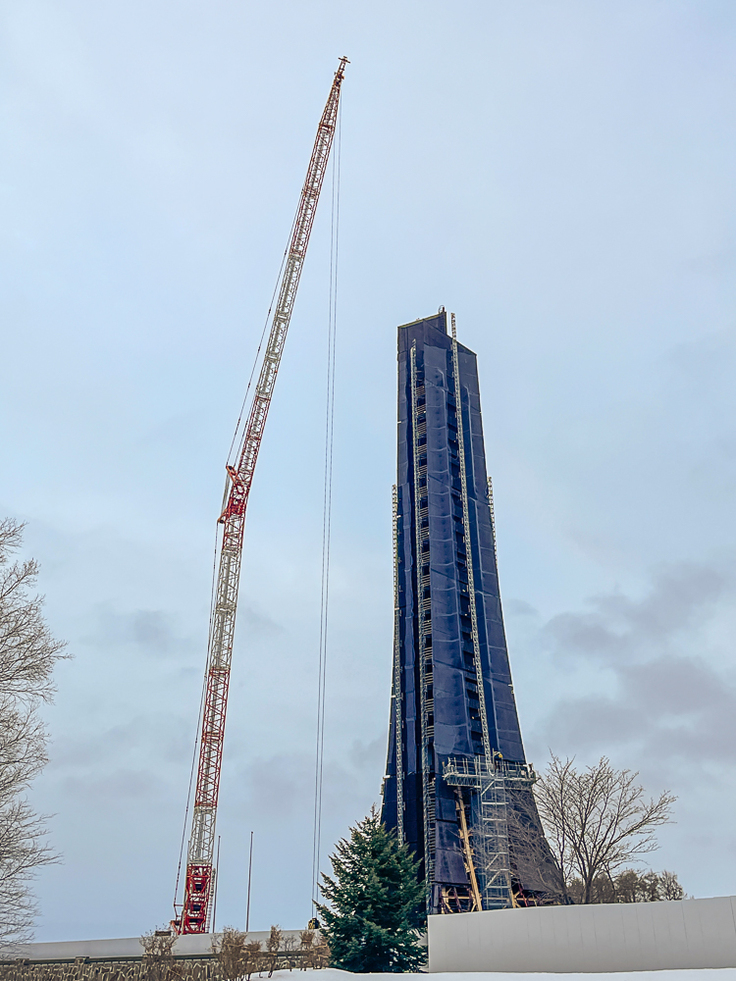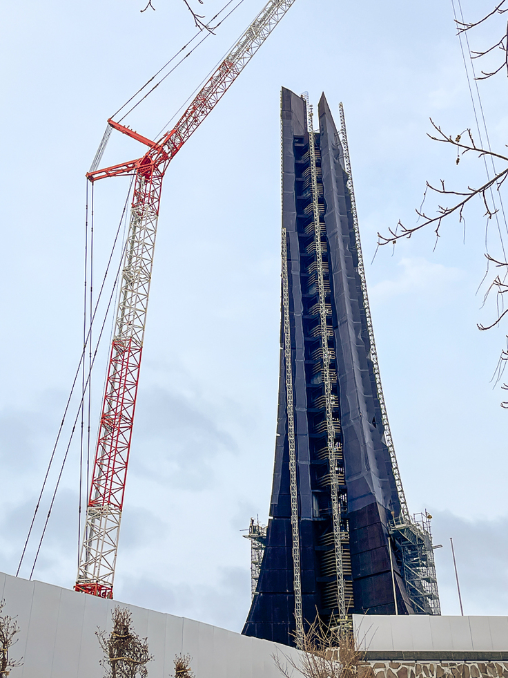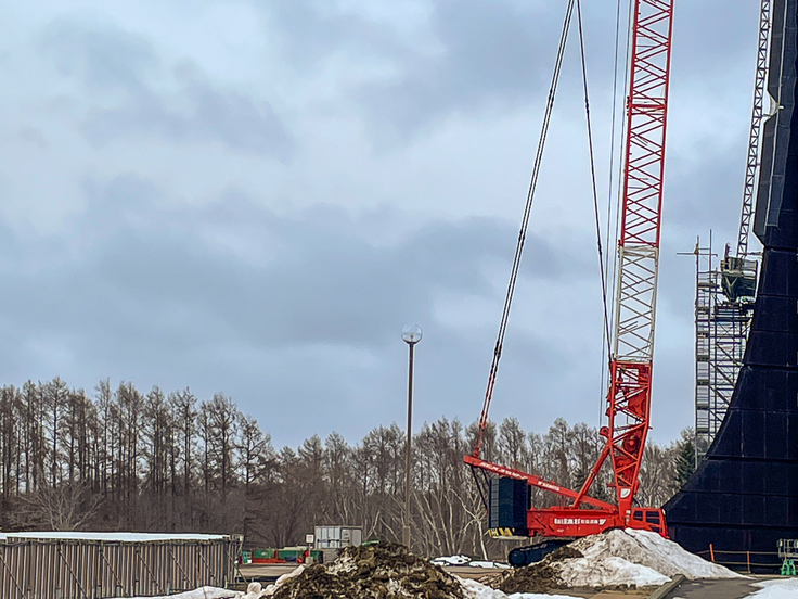 先週の木曜日に大型クレーンが搬入され、遠目に見るとオランダの風車のようなたたずまいとなっていますが、いよいよ解体作業は本格的になってきました。