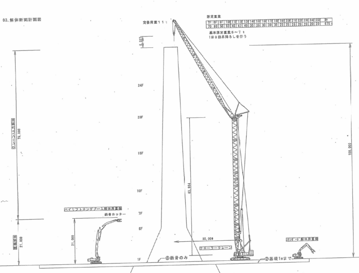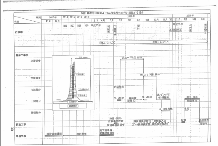 この図が描かれてからちょうど9年が経ちましたが、9年前の計画がまさに現実のものとなったのです。この図にも描かれている大型クレーンが立ち上がると、およそ2カ月半で塔は解体されます。私たちは解体差し止めを求めて行政訴訟を起こしていますが、塔が解体撤去されてしまえば、狭い意味の「訴えの利益」が無くなり、裁判も意味を失います。