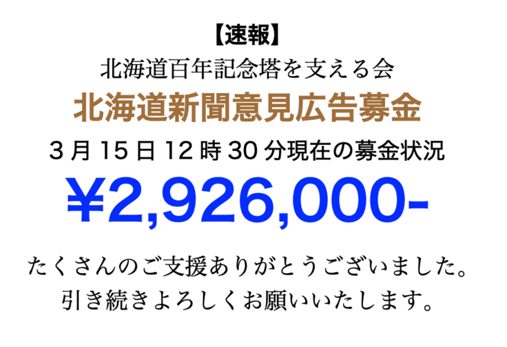 道新聞意見広告募金 3月15日12時30分現在 ¥2,926,000-