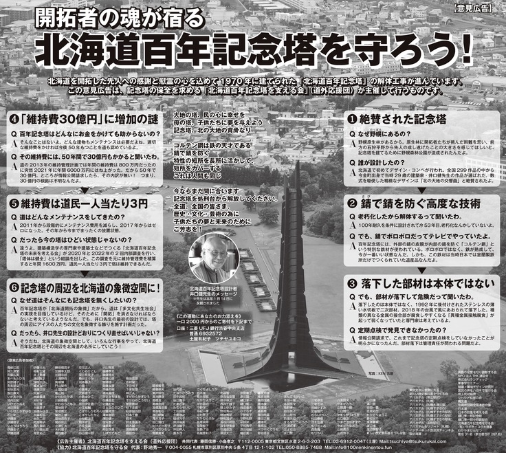 北海道新聞に北海道百年記念塔存続を求める意見広告を掲載する「北海道百年記念塔を支える会」の募金の最終集計として下記連絡がありました。