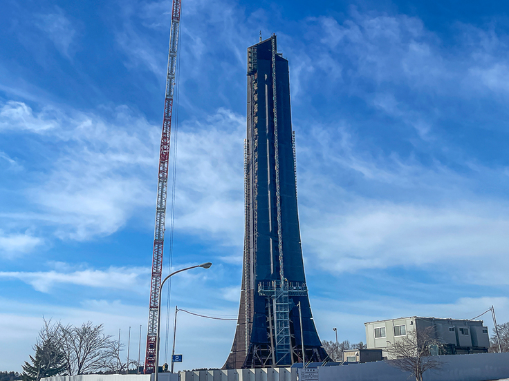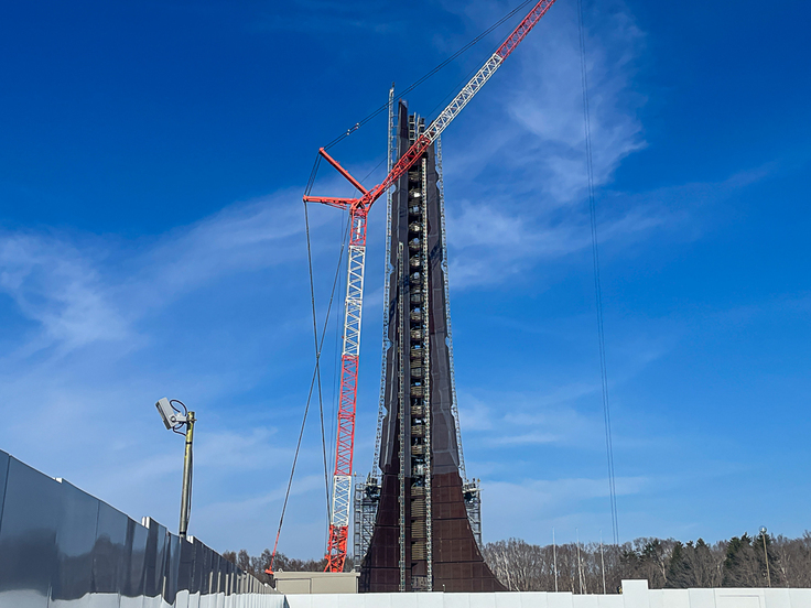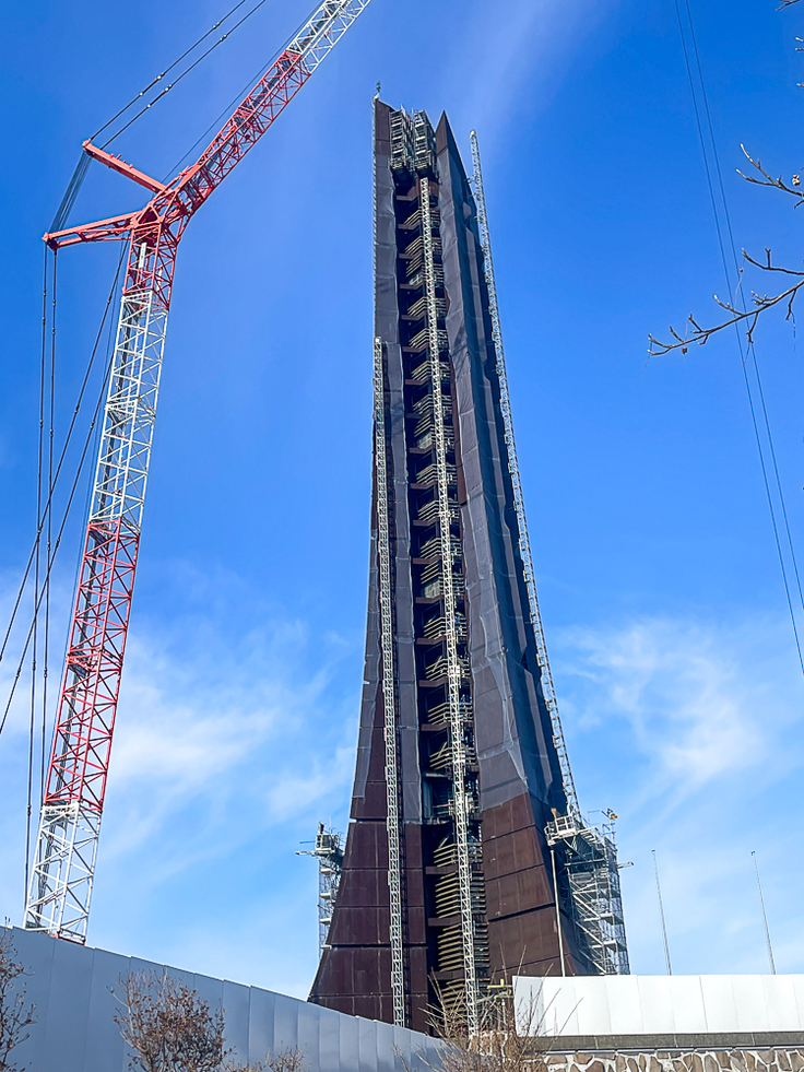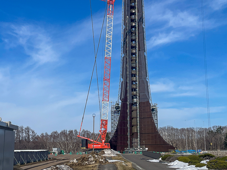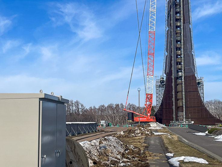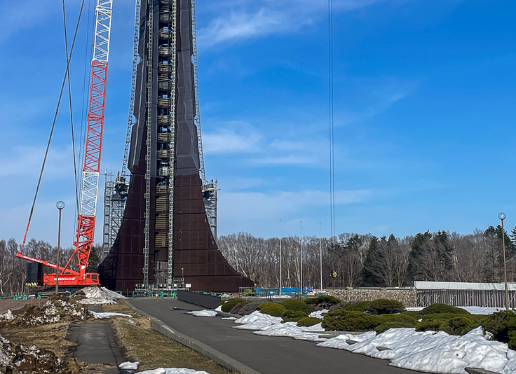 北海道にも遅い春がやってきました。記念塔の周りも急速に雪解けが進んでいます。本来なら春の訪れを喜ぶところですが、記念塔は大型クレーンが取り付けられて1週間。無残に拘束されていますが、まだ本体は姿を保っています。