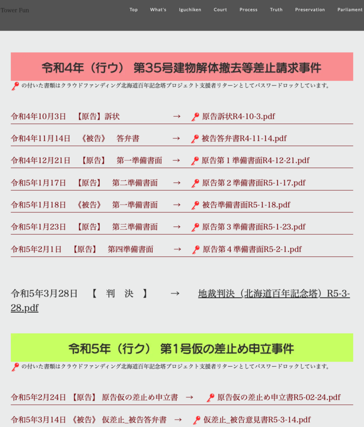 またReadyfor北海道百年記念塔プロジェクトのリターンとして、解体差止の仮の申立てに関する訴訟資料を公開します。閲覧にはパスワードロックが必要です。