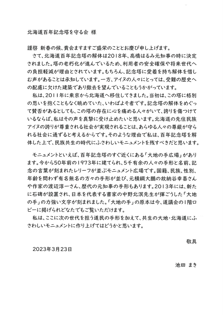 第20回統一地方選挙に向け、有権者に判断材料を示そうと知事候補、道議候補、主要政党にアンケートを行っているところですが、北海道知事候補の池田まきさんからアンケートの回答ではなく、書簡としていただきましたので、ここに掲載します。