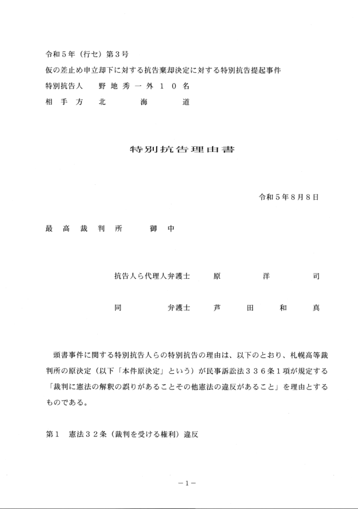 私たち訴訟団は、札幌高等裁判所に対して北海道百年記念塔解体を差し止める即時抗告を申し立てたところですが、6月31日に棄却の決定が下されています。このことを不服としてすぐに特別抗告を最高裁判所に申し立て、その理由書を8月8日に提出しました。(日付は8日ですが、実際の提出は裁判官ならびに顧問弁護士の夏季休暇を踏まえて先週末になっています)