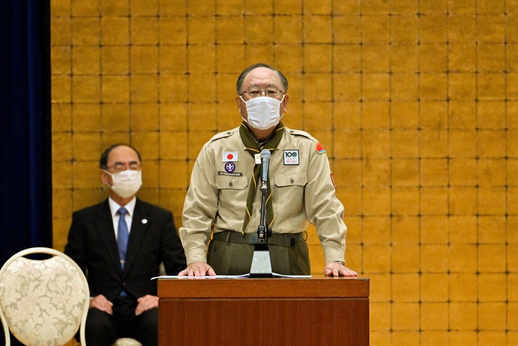 また44年前に初めて御殿場のジャンボリーに参加されてから多くの大会にもご参加いただき「スカウトキャンプや富士登山などはよい思い出」と語られました。よき社会人となるべく励んでいる姿は頼もしく思えるとお話しいただき、また「温暖化や生物多様性など地球環境の保全、防災の重要性が世界的に増す中で、自然への理解を深め、自然を友として親しむ心や能力を育むスカウトの活動は大変意義深いものであり、一層の発展を願っている」と述べられました。