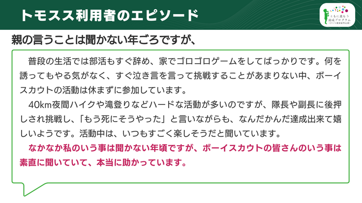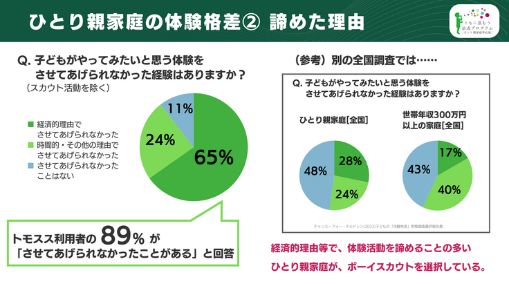 アンケート結果からは、経済的理由などで体験活動を諦めているひとり親家庭がボーイスカウトを選択していること、そして90%の方が子どもにボーイスカウト活動を長く続けてほしいと思っていることなどが見えてきました。
