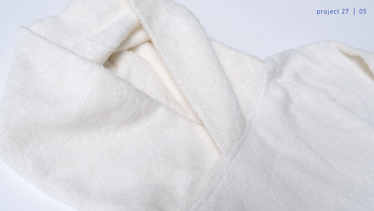 Everyone is familiar with terrycloth, from as early as the day we were born. Have you ever known someone to dislike a soft towel? Yet we had to ask ourselves - why isn’t this universally loved fabric widely incorporated into our everyday wear? To answer this, we examined the most commonly used textiles, and finally found a suitable 100% cotton soft terry-cloth as an alternative to cashmire, silk and rayon. Based in Japan, the luxury towel brand UCHINO has 34 branches globally, exclusivity on a luxury cruise line, and can boast of many celebrity fans. The brand offers ‘comfort, happiness, and a good night’s sleep.’ We have decided to collaborate with UCHINO and use their terrycloth for a unique, 27 interpretation of the hoodie.