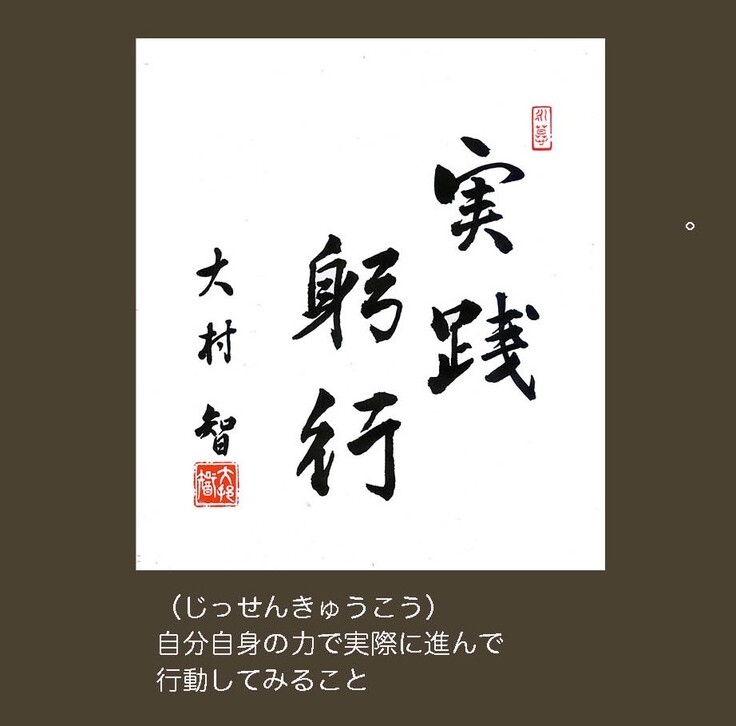4月に大村先生からいただいた色紙「実践躬行」を額に入れ大事に毎朝拝んでいる。