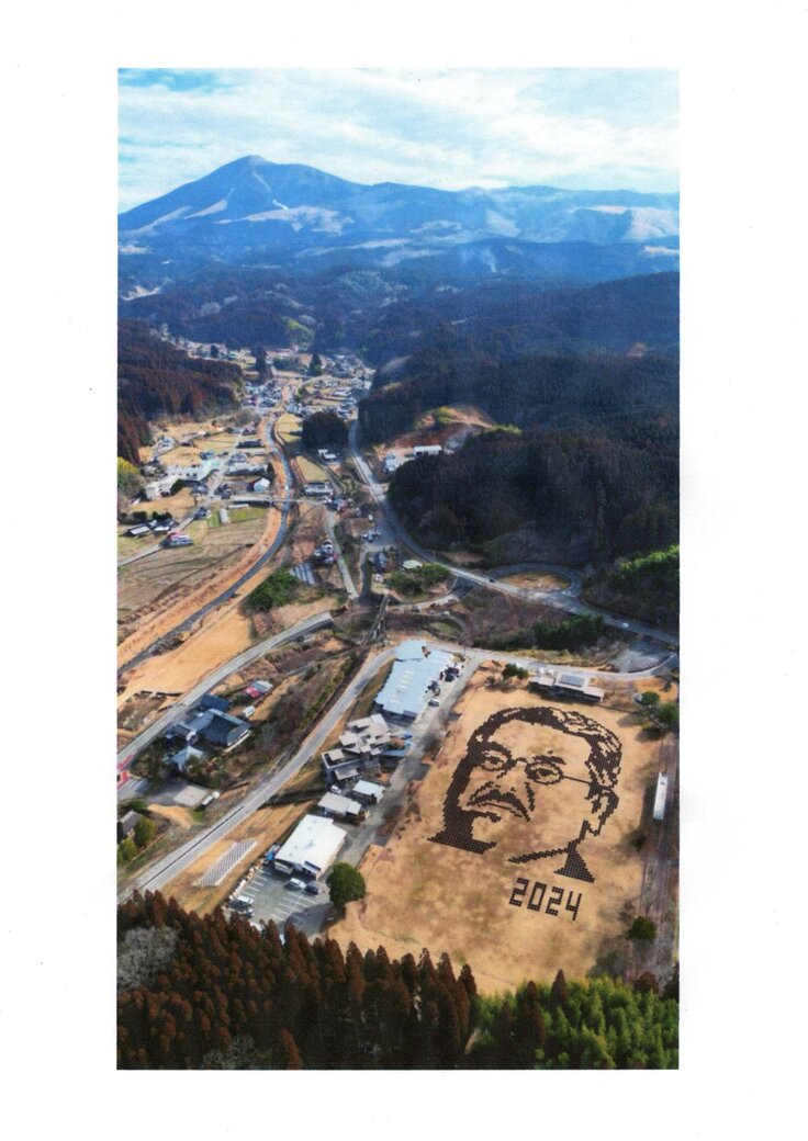 <小国富士の涌蓋山を見上げる北里柴三郎の地上絵>