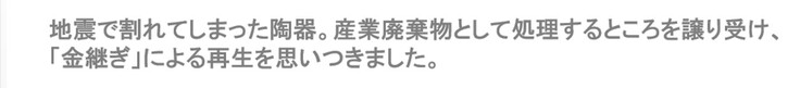 その声を聞き「故郷や友人のために、自分に復興に向けて何かできることは無いのだろうか」と何日も考え、思いついたのが壊れた陶器を「金継ぎ」で修復することでした。