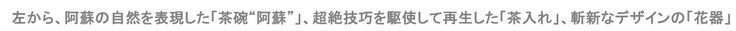 異なる伝統文化の技を持つ両地域の職人たちが実際に会い、話し、技術交流でつながることで、被災して壊れた陶器から「茶碗”阿蘇”」「茶入れ」「花器」など、新しい作品を創ることができたのです。