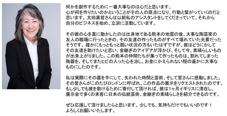 いくつもの天災を乗り越えてきた日本人のたくましさと、日本の伝統技法が現代の感性にも通じる美を持つことをロンドンで宣伝活動することで、世界に伝えようと思います。