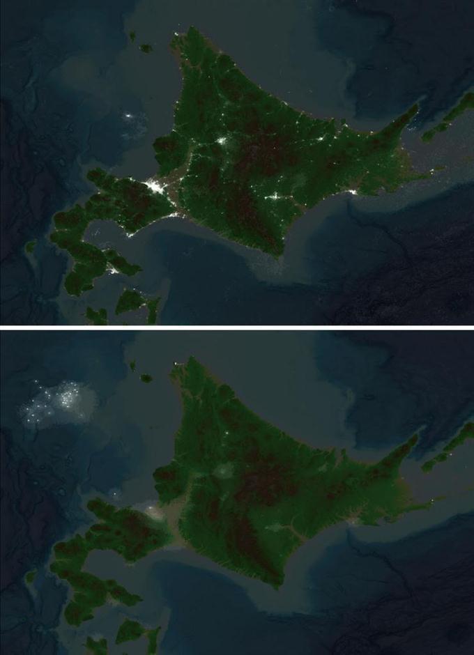 ※出典:産経フォト 「停電後、北海道が真っ黒 NASAの衛星が撮影」(2018/9/13)