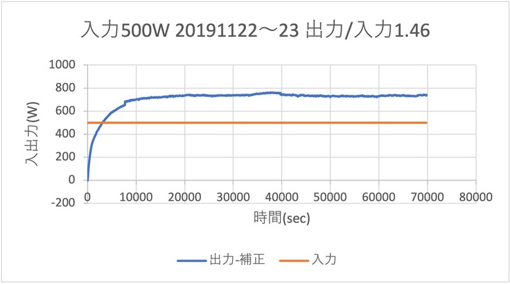 グラフ1:当社実験結果、測定例1で19時間にわたり1.46倍の過剰熱を安定的に発生