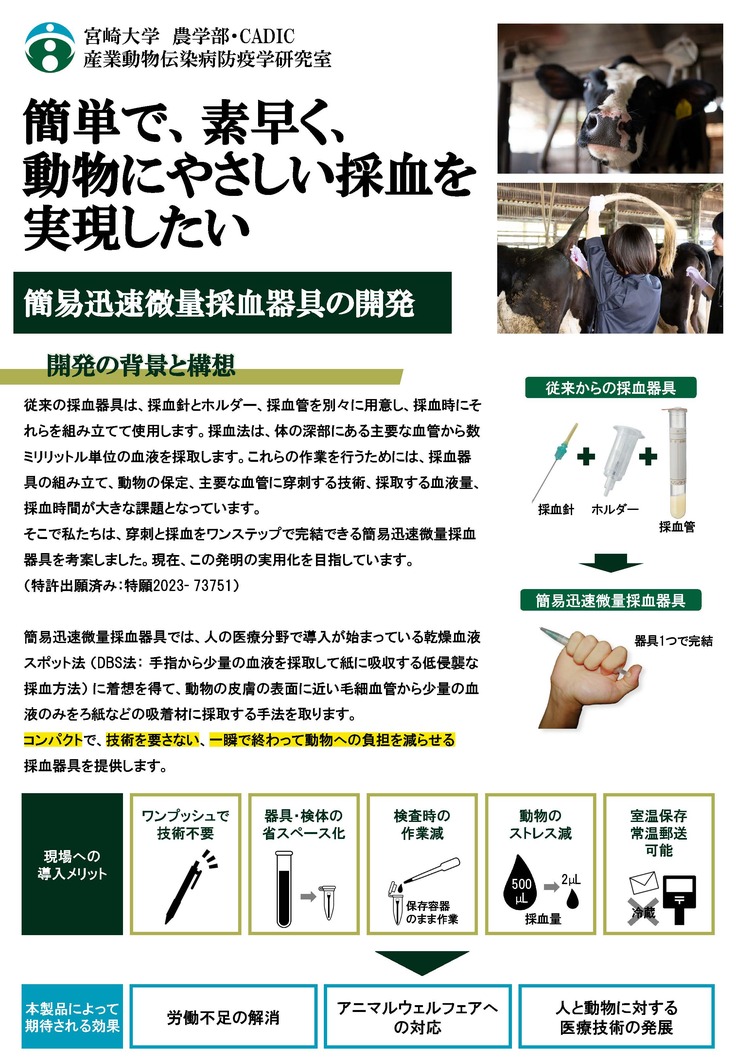 この研究成果は、アグリビジネス創出フェア2023で報告しました。特許も出願済みです。一刻も早くこの発明を製品化・実用化するために、関係機関と密に連携しながらスピード感を持って研究に取り組む所存です。引き続き、私たち研究チームを、そして宮崎大学をどうぞよろしくお願い致します。