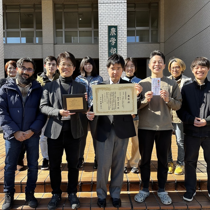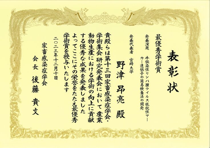 野津昂亮研究員(宮崎大学農学部)と関口敏教授(宮崎大学産業動物防疫リサーチセンター・農学部)らの研究チームは、第13回家畜感染症学会学術集会(2023年12月9~10日@東京大学)において、牛伝染性リンパ腫ウイルスに感染してもウイルスが増えにくい遺伝学的体質 (抵抗性)をもつ牛を同定するためのPCR技術の開発と、タカラバイオ株式会社との共同研究による同技術の製品化(BLV Resistant Marker Gene Detection Kit)について発表し、その研究が高く評価され、最優秀学術賞を受賞しました。(写真上段:前列中央が野津研究員、写真中段:表彰状、写真下段:盾)