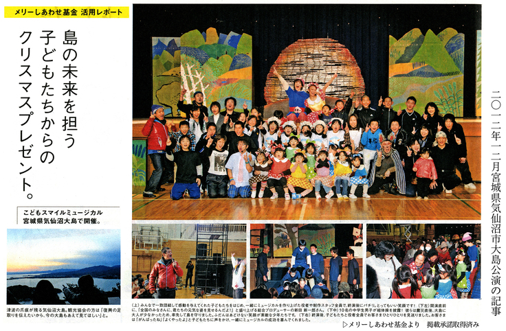 当団体は東日本大震災の三日後から東北三県の被災地の子ども達、子どもを支える大人達へ①物資支援②義援金支援協力③被災地、避難所でのコンサートや人形劇、ミュージカル公演活動を続けています。中でもプロの役者やダンサーと現地の子ども達が3日間という短期間で舞台を作りあげるミュージカルプロジェクトは、強い思いを持って生きる大切さ、友達と協力することの嬉しさ大切さを子ども達が体感し、今後被災地再建へ向かう人材を育てるものとして、参加者はもちろん、保護者や観客からも高い評価を受けています。現在は、震災から10年以上経ちながらも未だ復興途中の福島県沿岸部を中心に、年に数回の公演を行なっています。