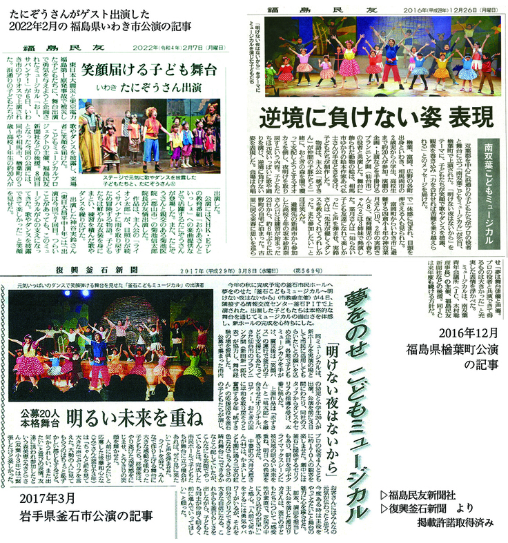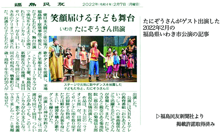 今年2月にはNHK「おかあさんといっしょ」の体操“ブンバ・ボーン!”でおなじみ、あそび作家「たにぞう」(震災後、継続的に福島でコンサート活動中)にも、ゲスト出演していただきました。(「たにぞう」さんより名称掲載許の諸取得済み)