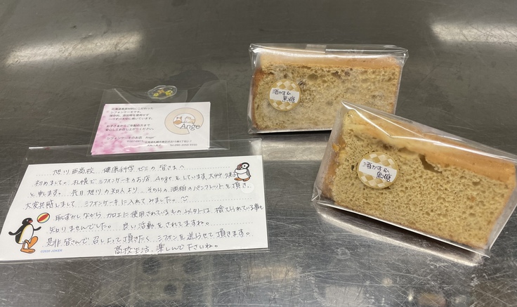 本日、リーフレットで私たちの活動を知った札幌市にあるシフォンケーキのお店「Ange」さまから、酒粕を使用したシフォンケーキを送っていただきました。ご丁寧にお手紙も付いていて、心づかいにすごく感動しました。チームのメンバー数名でさっそく試食させてもらいました。とてもふわふわしていて、酒粕の香りが感じられる美味しいケーキでした。