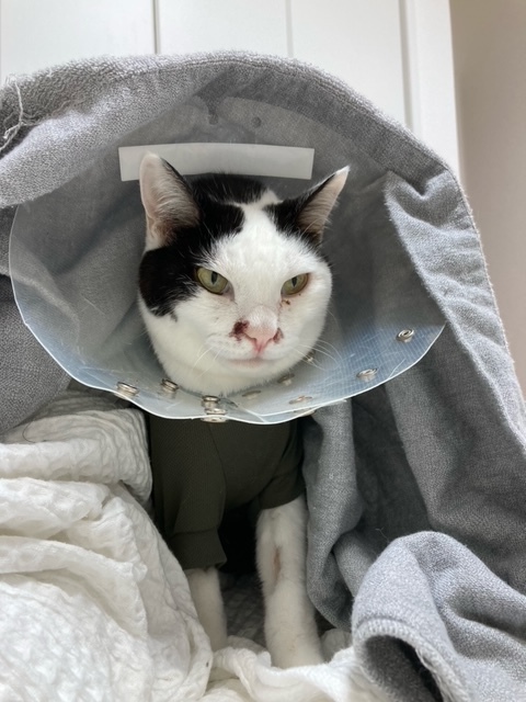 その薬、傷跡を舐めないようにするため、服を着て、エリザベスカラーもしてもらっています。