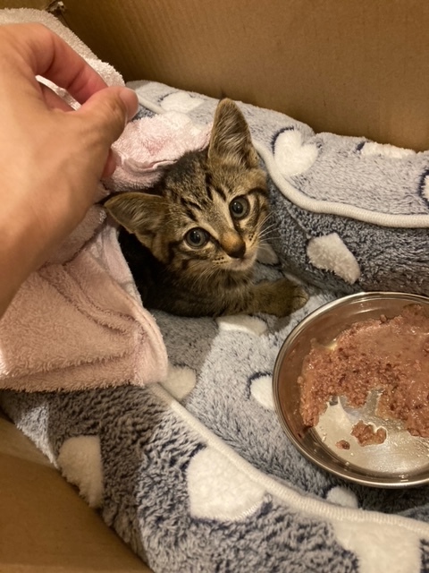 タオルでくるんで無事確保。段ボールハウスに入ってもらい、業務終了時間まで過ごしてもらいました。