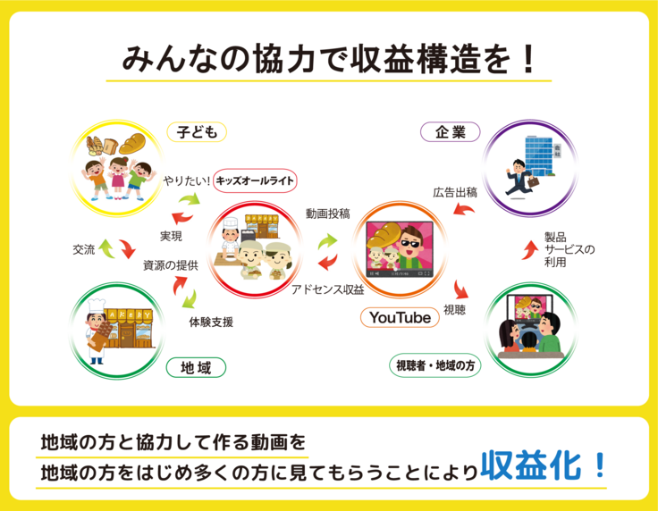 YouTubeはたくさんの人に見てもらうことによって収益化され、企業から広告費をいただくので子どもたちへの平等な支援や携わって下さる方への還元も可能です。