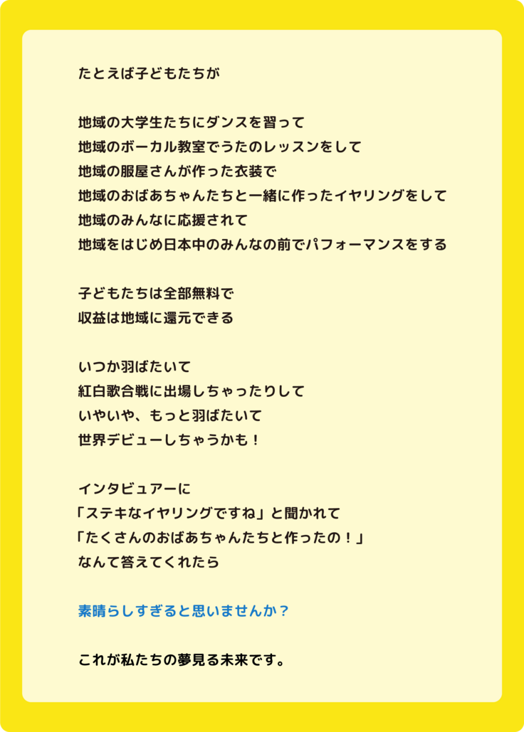 また今回のクラウドファンディングを通して皆さんに仲間に加わってほしいと思います。撮影や編集をしてくれる方、企画を考えてくれる方、出演してくれる方、コラボしてくれる方など興味があればぜひご連絡ください。子どもの参加もお待ちしています。