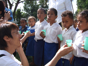 歯が痛くて歯科室に子供が来院した時に、トンガ人歯科スタッフは,歯を抜いたりする時に泣く姿を見て、むし歯予防を行うこのプログラムを広めれば子供達が歯の痛みから解放されて笑顔で過ごせるようにと考えたプログラムです。