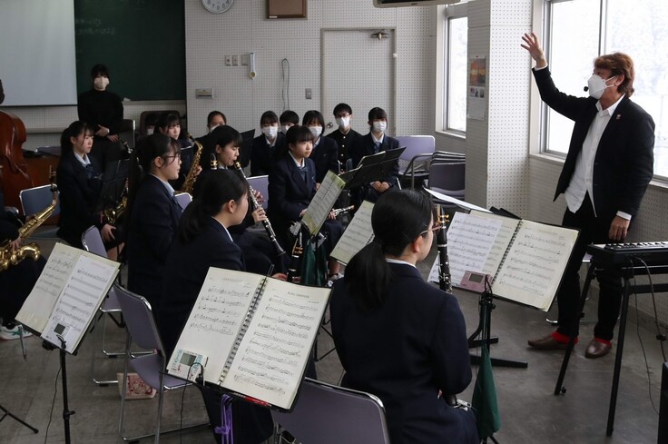 これまで制作されてこなかった校歌と応援歌の音源作成を県内の音楽家の協力を得ながら行っています。生徒会が中心となって結成されたコーラス隊を歌手の布上智子さんが指導。