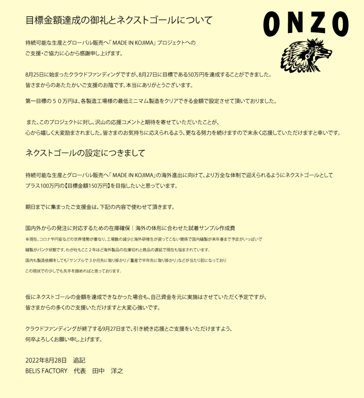 最後に最後までお読みいただき、本当にありがとうございます。 私たちは、「岡山の魅力発信」と「サスティナブルな岡山県」を目標にこれまで想いを膨らませ、持続可能である前提で未来の岡山を創造する思いで今回のプロジェクトを始めました。 新型コロナウイルス感染症、円安、物価高騰などいろいろな経済の影響により多くのアパレル企業が大きなダメージを受けております。また同時に今までにないスピードで時代も加速し、「地球」や「人権」「環境」を考える必要性が高くなっております。 岡山が新たな切り口でアパレル業界・ジーンズ産業を岡山が引き続きリードしていくためにするにあたっては大きな活動です。世界屈指のジーンズ産業であり続けるために、環境や人権を考えている産地として世界へ発信できるよう応援よろしくお願いします!