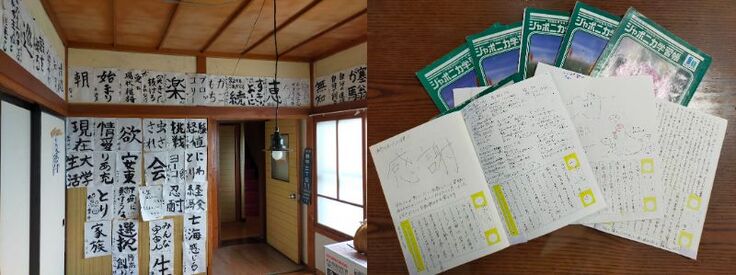 (写真はうちに滞在する人が最後の日に書く宿題。習字と絵日記)