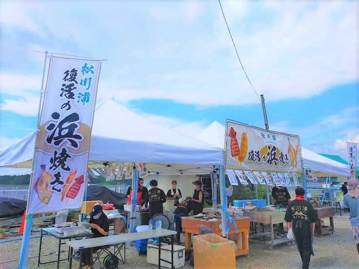 【松川浦海水浴場】…夏場は海水浴客で賑わい、土日は相馬の新鮮な魚を路上で焼いて提供する、伝統の「浜焼き」も最近復活しました。磯の香りが食欲をそそります。海岸エリアには日帰り入浴のできる温泉旅館もたくさんあります。
